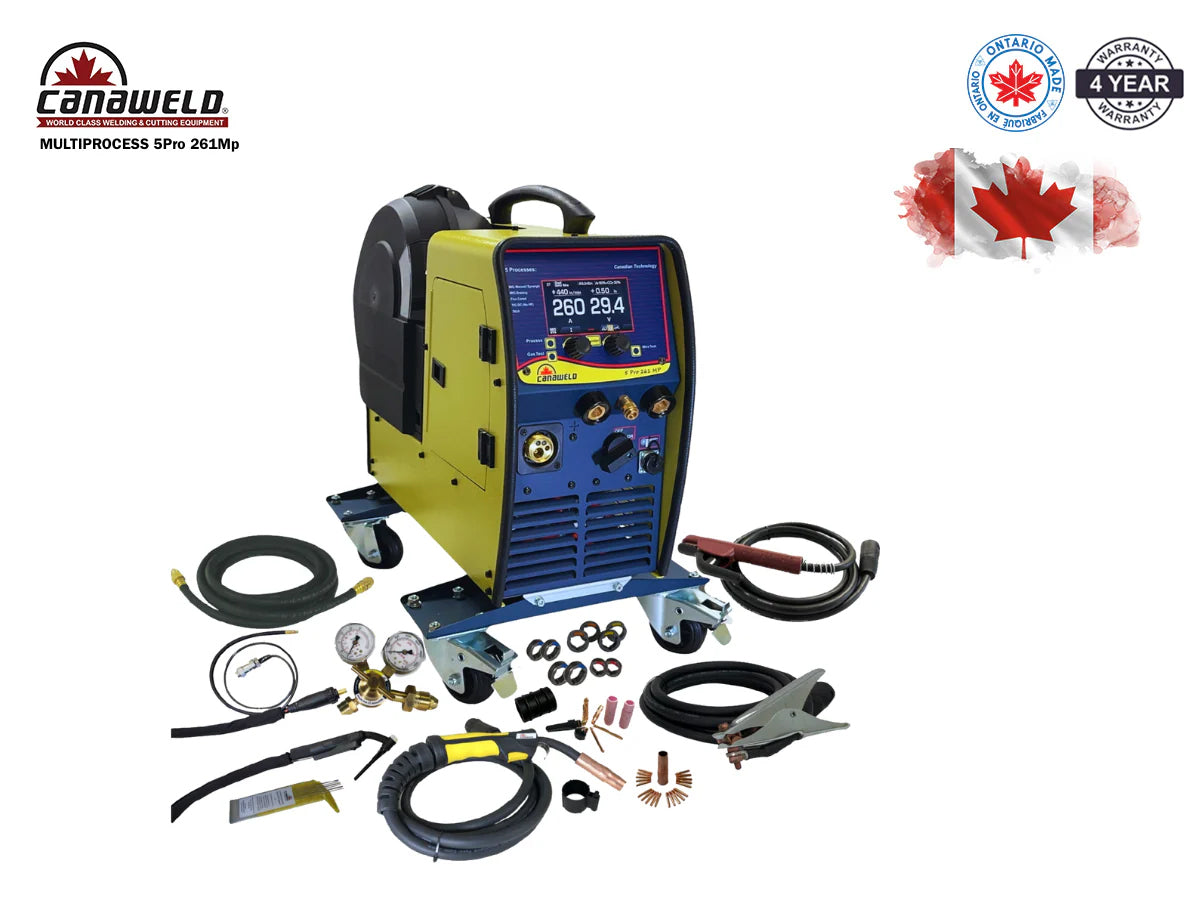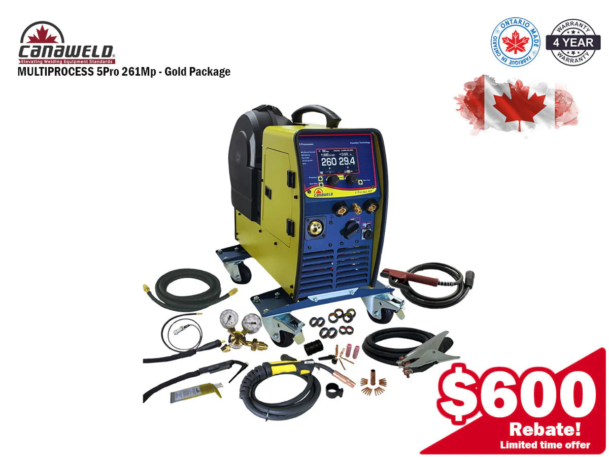 La Canaweld Multiprocess 5 PRO 261MP es una soldadora multiproceso de alto rendimiento y alta resistencia, diseñada para brindar precisión, potencia y durabilidad en aplicaciones de soldadura industrial. Esta soldadora, fabricada en Canadá, admite soldadura MIG Pulse (manual y sinérgica), MIG Brazing, con núcleo fundente, TIG DC (sin HF) y con electrodo revestido , lo que la convierte en una de las soluciones de soldadura más versátiles y confiables del mercado. Con uno de los ciclos de trabajo más altos de su clase en Norteamérica, entrega 260 A al 60 % del ciclo de trabajo y 230 A al 100 % del ciclo de trabajo (a 40 °C/104 °F). Diseñada para un rendimiento industrial de alta resistencia, esta soldadora Canaweld proporciona una estabilidad de arco excepcional a la vez que es portátil y fácil de mover, lo que la hace ideal para talleres de soldadura, sitios de trabajo y operaciones de campo. Canaweld ofrece la única garantía de 4 años en Norteamérica, lo que garantiza una confiabilidad inigualable y un rendimiento superior. El alimentador de alambre de 4 rodillos de alta resistencia proporciona una alimentación de alambre suave y uniforme, mejorando la eficiencia y precisión de la soldadura. Diseñado para trabajar con todo tipo de metales, incluyendo aluminio, acero inoxidable y aleaciones, el Canaweld Multiprocess 5 PRO 261MP establece un nuevo estándar en la industria en innovación, eficiencia y durabilidad en soldadura. Esta soldadora multiproceso industrial es la mejor opción para soldadores profesionales que buscan equipos de soldadura de alta calidad fabricados en Canadá.