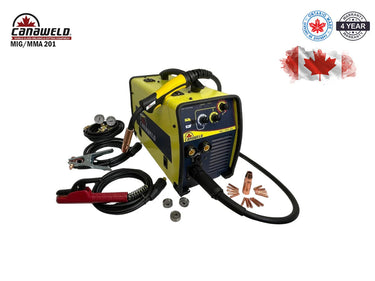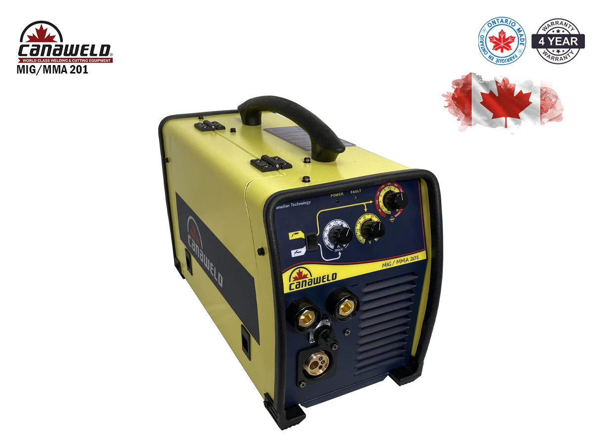 La MIG/MMA 201 es una soldadora MIG/electrodo portátil, potente y versátil, fabricada en Ontario . Esta unidad puede soldar acero de hasta 9,5 mm (3/8") en modo MIG o en modo SMAW . Admite alambre MIG de 0,6 mm (0,023") a 1,1 mm (0,045") o varillas SMAW de hasta 0,6 mm (3/16") con un arco muy estable (consulte la ficha técnica para obtener más información). Estas características la convierten en la opción ideal para trabajos de soldadura de intensidad ligera a media, ya sea en su garaje, en casa o en su taller mecánico.