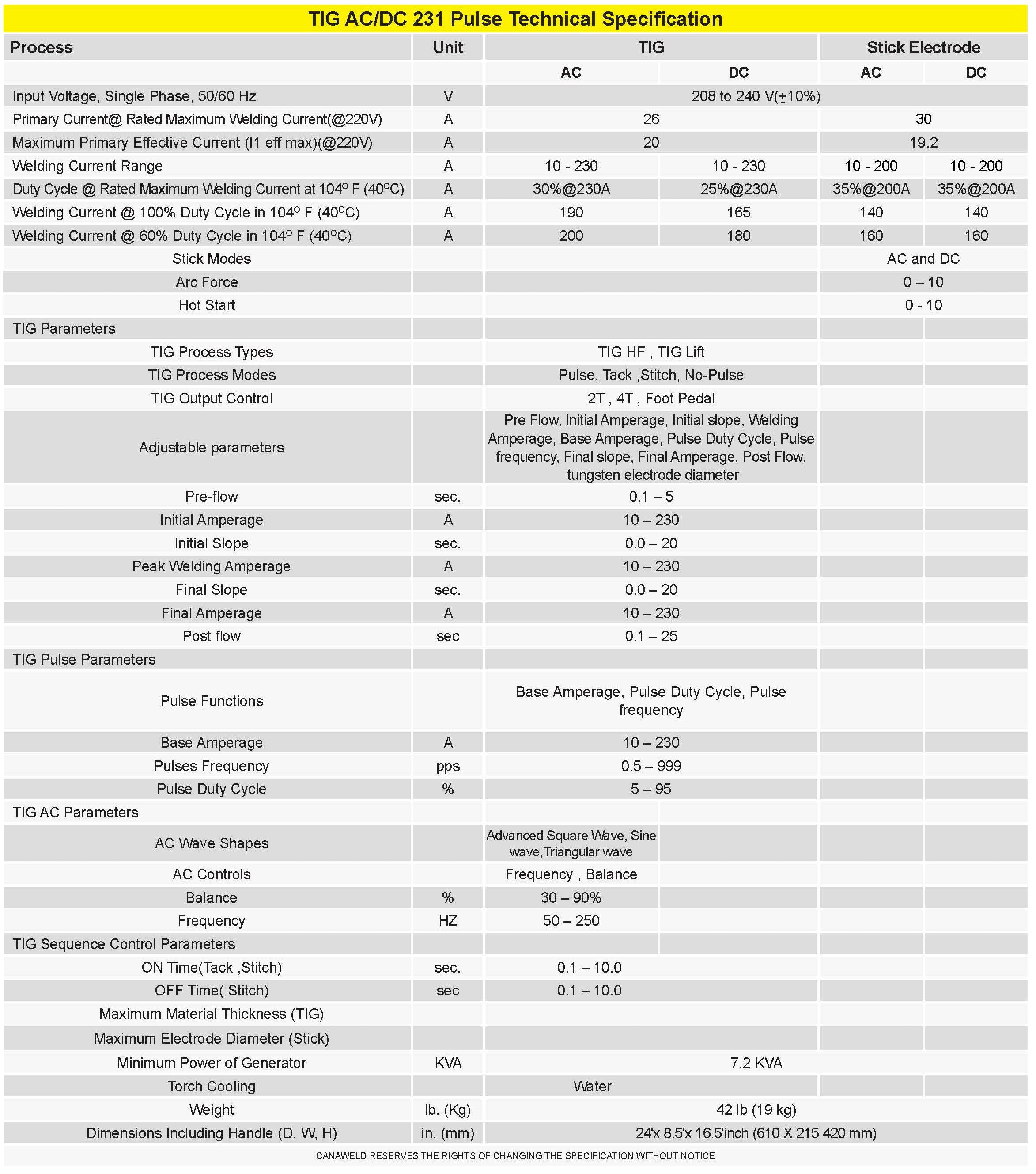 The TIG AC/DC 231 Pulse is a powerful, heavy-duty, and portable Canadian-made welding machine designed for industrial use. Despite its robust performance, it remains easy to carry. Equipped with advanced pulse waveforms, full professional functions, and HF start, it delivers high-quality TIG welds on both thick and very thin materials, ensuring precision with minimal distortion.